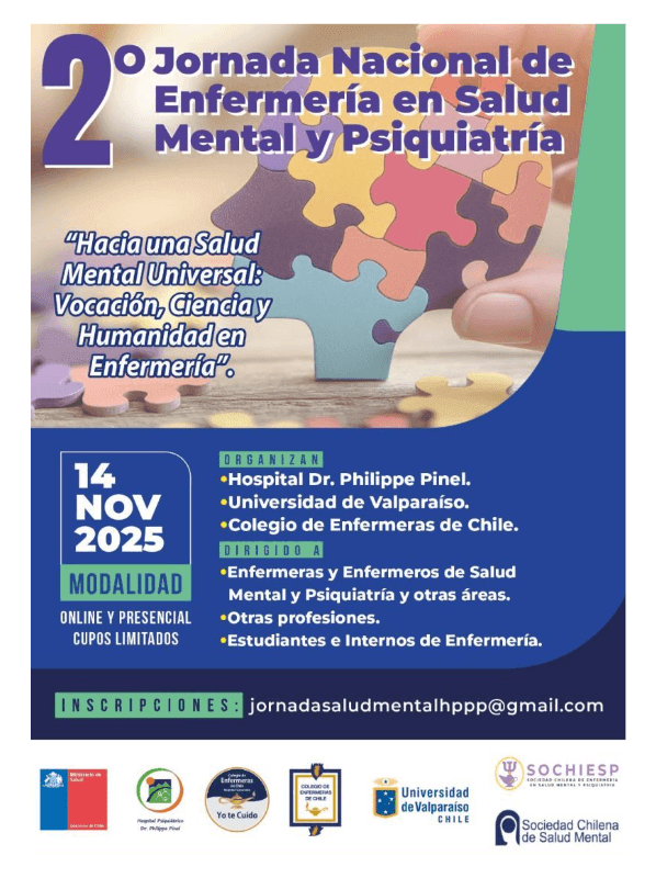 El equipo de enfermería del Hospital Dr. Philippe Pinel invita a participar en la Segunda Jornada Nacional de Enfermería en Salud Mental y Psiquiatría, una instancia gratuita, patrocinada por el Colegio de Enfermeras de Chile, y abierta a profesionales y estudiantes del área de la salud.
